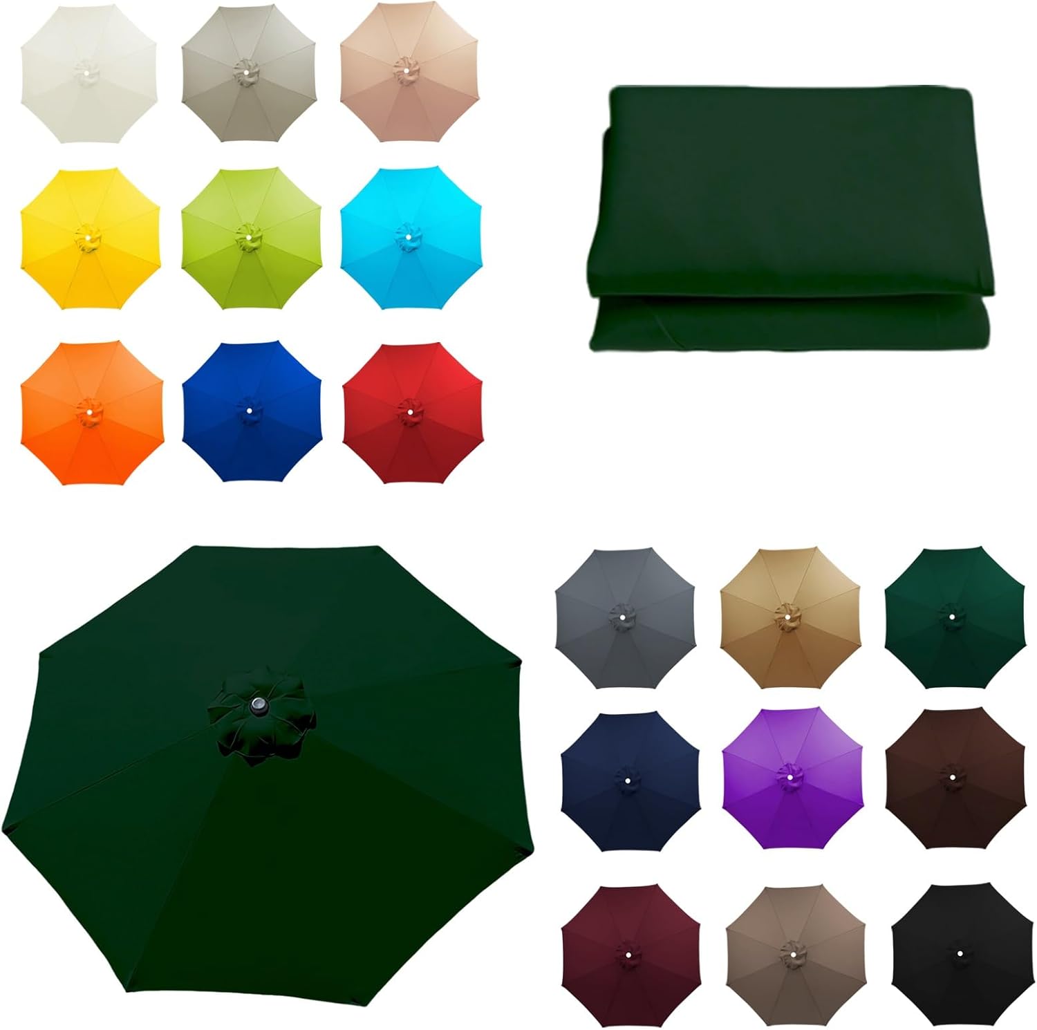 If you are distressed that the canopy of the patio umbrella is no longer bright because of the wind and sun, but it's not cost-effective to replace an umbrella just for faded umbrella canopy, this umbrella canopy will be a better choice. It not only has a lot of colors to give you more choices, but also has good quality. You can spend far less than to buy an umbrella to update your umbrella. Make your umbrella beautiful and add freshness to your life.SpecificationProduct Name: Umbrella Replacement CanopyMaterial: Polyester FiberColor: Black , Red , Beige , Dark green , Khaki , Navy blue , Burgundy , Coffee brown , Top color , Gray , Lake blue , Yellow , Blue , Grass green , Orange , Dark top , Champagne , Purple.Ribs: 6/8 RibsSize: 6.5FT/2.0M , 7.5FT/2.30M , 8.2FT/2.50M , 9FT/2.70M , 9.2FT/2.80M , 10FT/3.0M , 11.5FT/3.50MNotice:Replacement Umbrella Canopy ONLY (umbrella ribs, pole and top finial are not included)